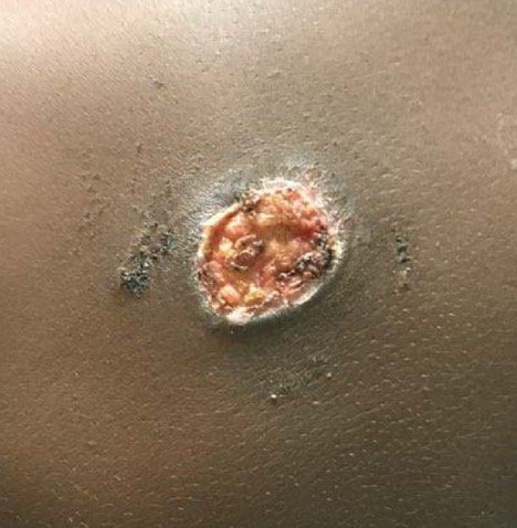 The patient had a 5 cm ulcerative lesion with raised borders and a yellow, “fatty” center. There was no active drainage, site tenderness, or lymphadenopathy.