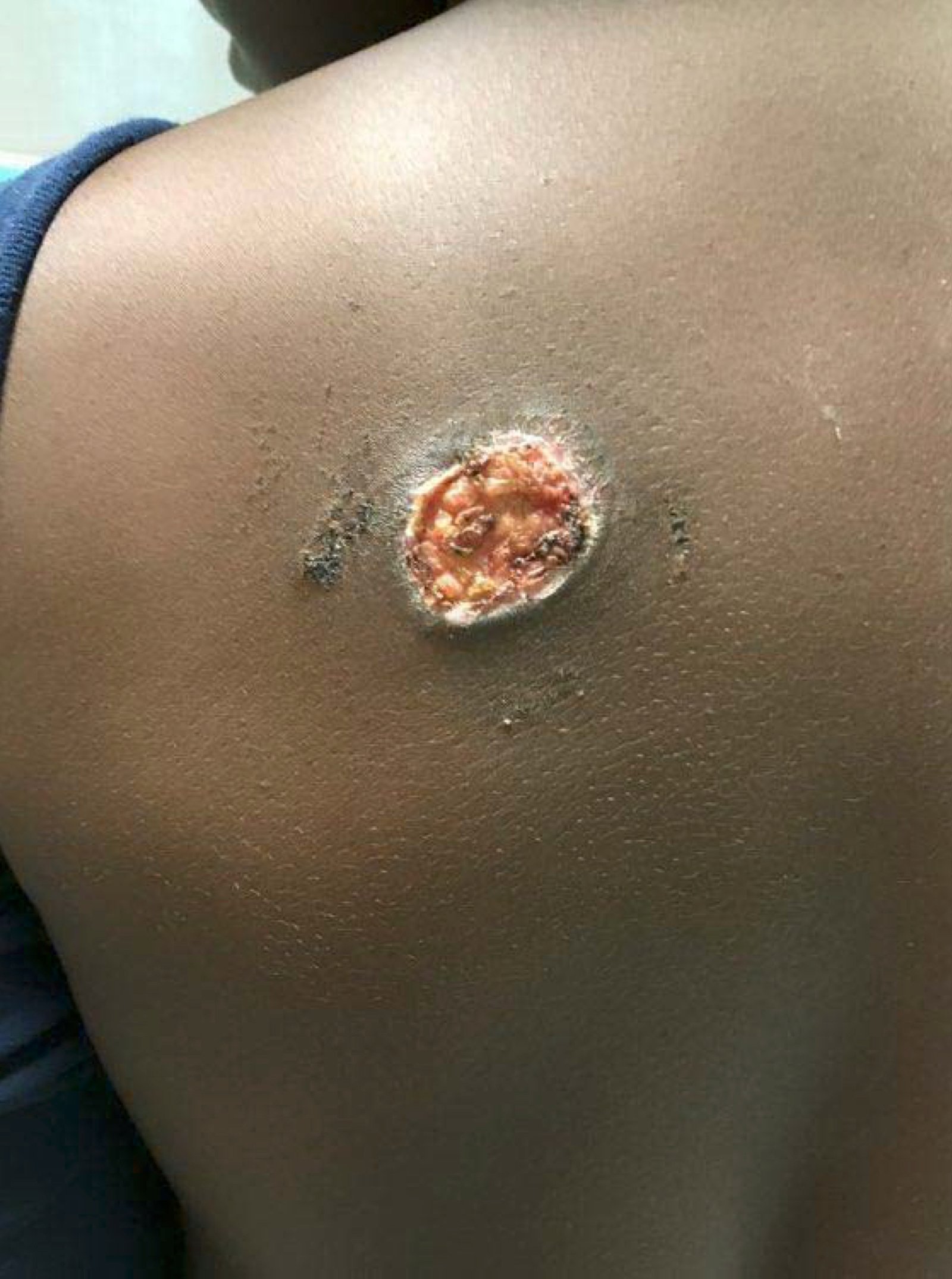 An 11-year-old male presented to the emergency department (ED) in southern Texas with a worsening circular skin lesion on his back. The lesion was noted three weeks prior to presentation after a day at the park “splash pad.” Despite application of a topical antifungal, the lesion expanded and developed scant yellow drainage with tenderness. His primary physician prescribed cephalexin for a staphylococcal infection based on a wound culture but referred the patient to the ED given continued progression of the lesion. He had no other associated symptoms. No travel history, animal exposures, or tuberculosis contacts were identified. He had normal vital signs for age.