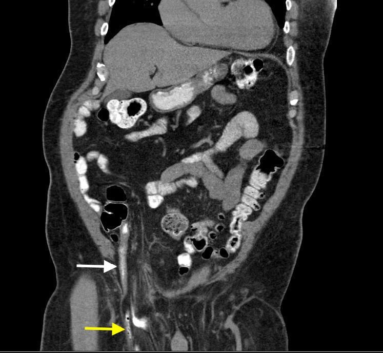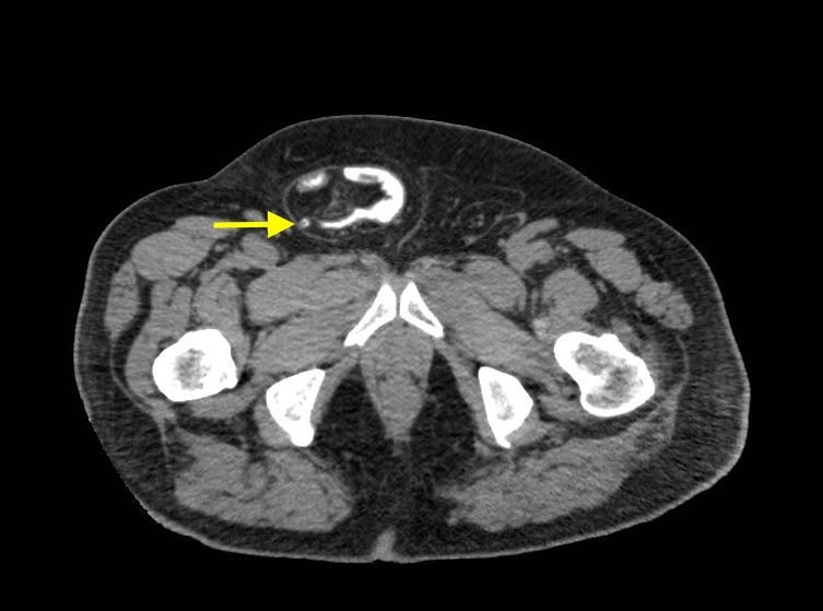 A 67-year-old male, with a history of diabetes, coronary artery disease, and chronic kidney disease, presented with two weeks of a new right inguinal bulge and right lower quadrant abdominal pain extending to the groin. He denied nausea, vomiting, fever, and changes in bowel movement. His initial vital signs were: temperature 37.4°C, blood pressure 142/100, heart rate 62, and respiratory rate 18. Physical examination revealed mild right lower quadrant abdominal tenderness, right inguinal and testicular tenderness and swelling, and a non-reducible bulging inguinal mass with no overlying skin changes. Lab results showed a leukocytosis of 13.6×103/mm3.