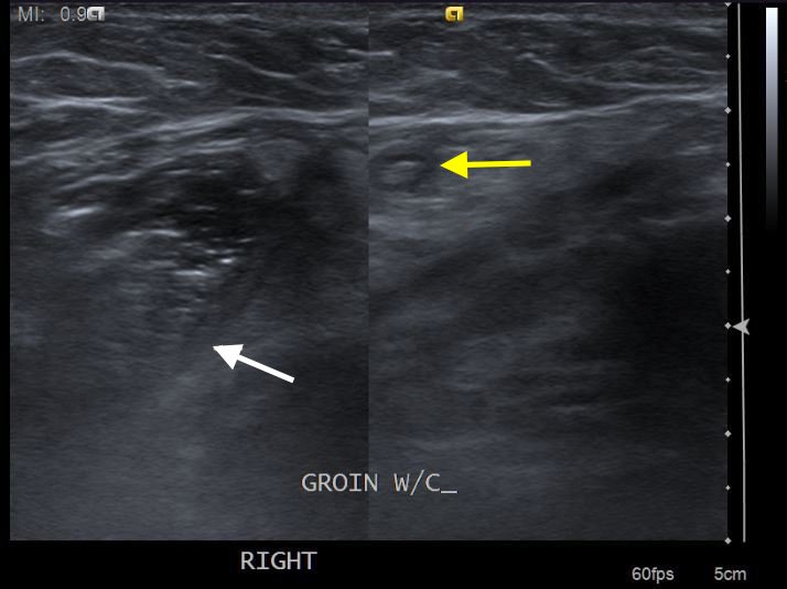 Ultrasound of the right scrotum shows a right inguinal hernia with an air-containing loop of bowel (white arrow) and a non-compressible appendix (yellow arrow). Coronal and axial views of abdomen-pelvis CT show a right inguinal hernia containing a loop of small bowel (white arrow) and appendix (yellow arrow).