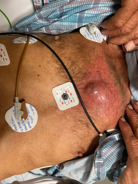 Blunt chest trauma, chest wall abscess, sternal fracture complication.