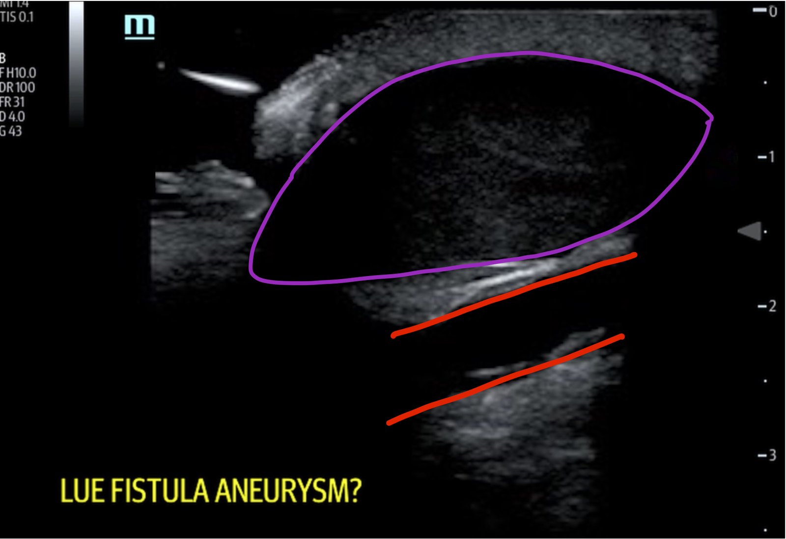A bedside ultrasound of the mass demonstrated a large compressible hypoechoic structure (see purple outline) above the arteriovenous graft (see red outline). The contents demonstrated movement of fluid within the structure. This was confirmed with Doppler mode, which allowed for visualization of flow communicating between the structure and the underlying vessel, which is diagnostic for a pseudoaneurysm.