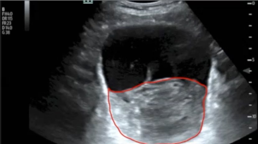 Bladder POCUS demonstrated 500mL of post void residual fluid, indicative of retention. Half of the volume is hyperechoic (red circle); this is likely the bladder wall hematoma. Could also consider sonographic artifact, bladder mass, or cystitis.1-2