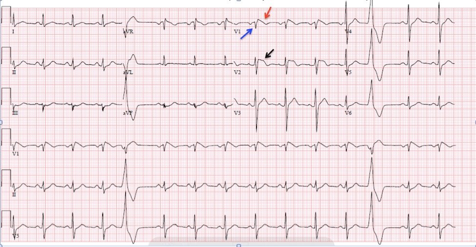 ECG shows an incomplete right bundle branch block (blue arrow) with coved ST segment elevation and an inverted T wave in V1 (red arrow) and ST segment elevation in V2 (black arrow).