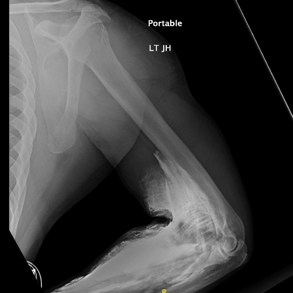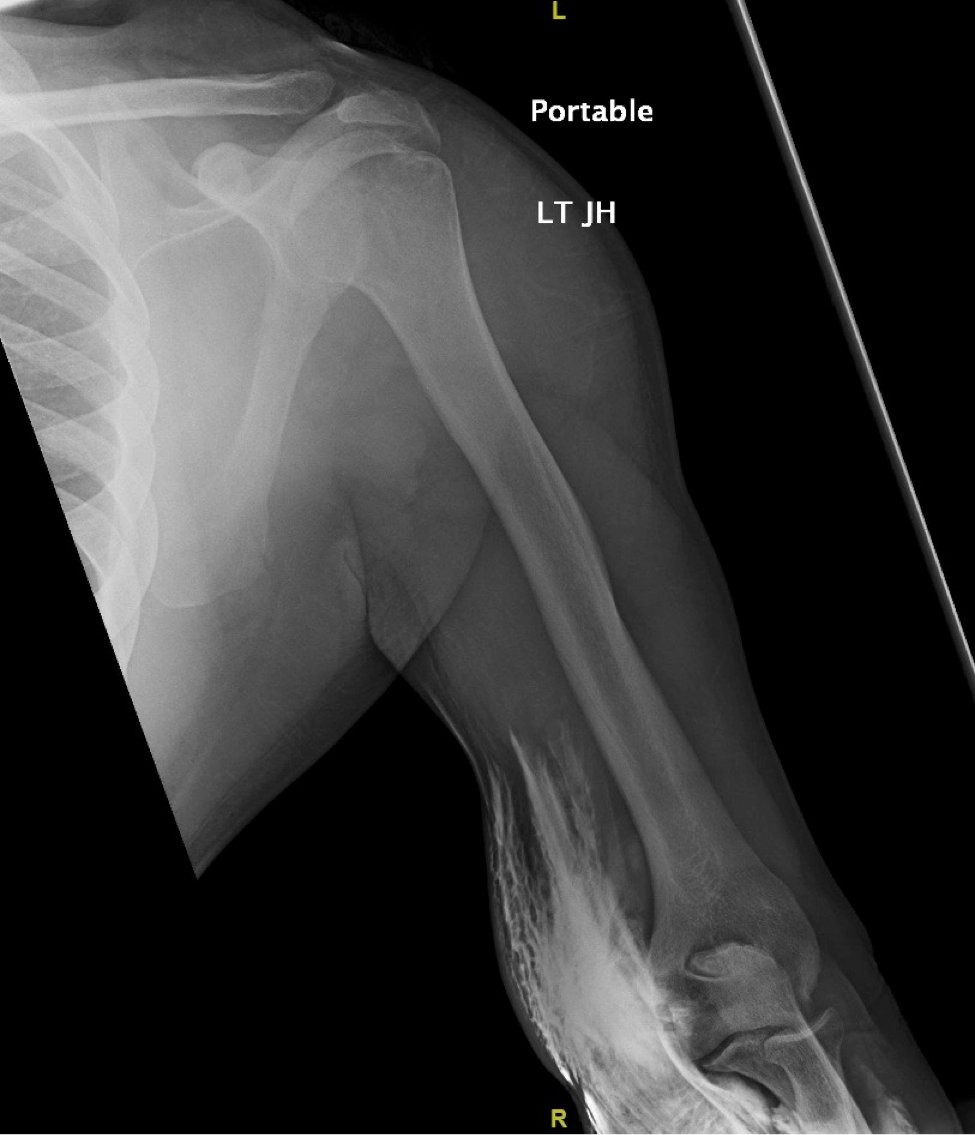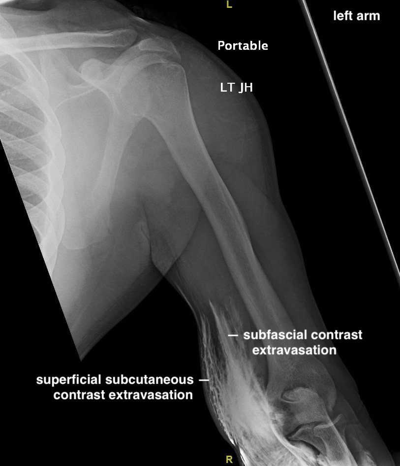 A 39-year-old male with a history of type 2 diabetes was brought in by ambulance to the emergency department as a trauma status post motor vehicle versus pedestrian accident. The patient was walking along a surface street when he was struck on the left side of his body by a vehicle traveling approximately 35 miles per hour. On arrival, he complained of generalized left-sided body pain. An 18-gauge intravenous (IV) line was placed in the left antecubital fossa and a computed tomography (CT) of the chest, abdomen and pelvis was obtained with iodinated contrast. Shortly after acquiring CT images, portable radiographs were taken of the upper and lower extremities revealing iodinated contrast extravasation into the left distal arm, left antecubital fossa and left proximal forearm. Other than mild left-sided shoulder pain, the remainder of the patient’s left upper extremity was asymptomatic. The patient had an unremarkable neurovascular exam and upper extremity compartments were soft. Throughout the patient’s ED course, there were no further signs or symptoms of compartment syndrome (ie,the classic 5 P’s of pain, paresthesias, pallor, paralysis, and pulselessness).