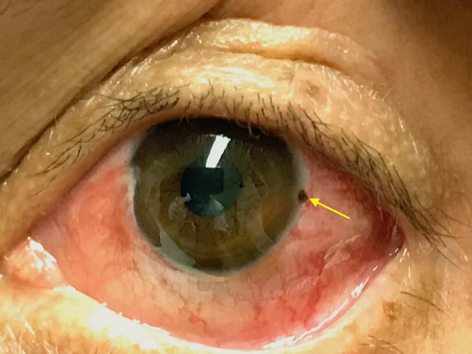 The photograph reveals a limbic metallic foreign body with a surrounding corneal rust ring (arrow) in the three o’clock position of the left cornea.