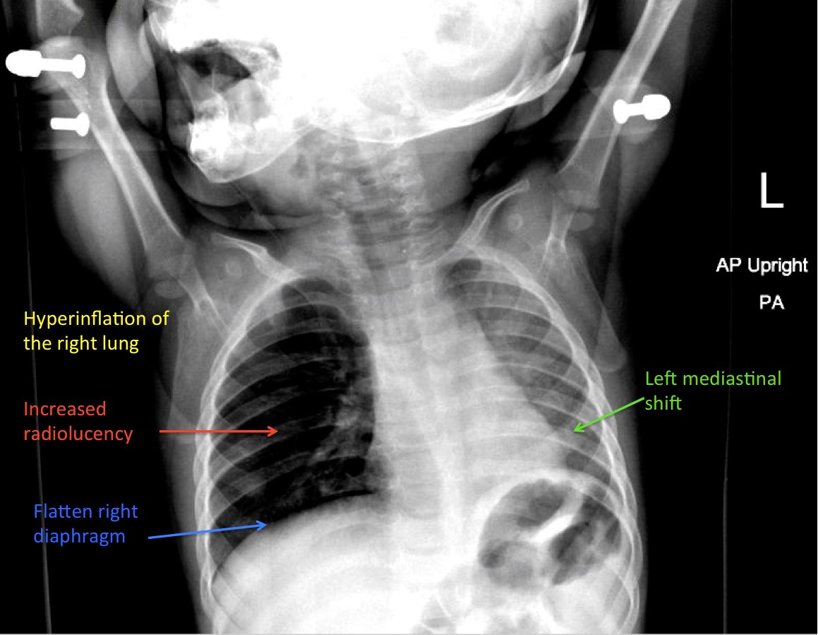 Chest radiograph showed increased radiolucency (red arrow) and flattening of the diaphragm on the right side (blue arrow) consistent with hyperinflation of the right lung, as well as left mediastinal shift (green arrow), indicating obstruction.