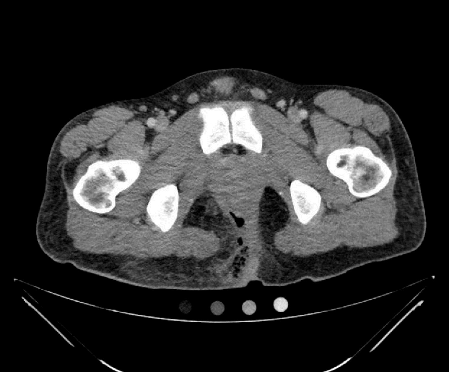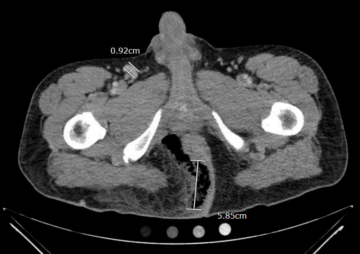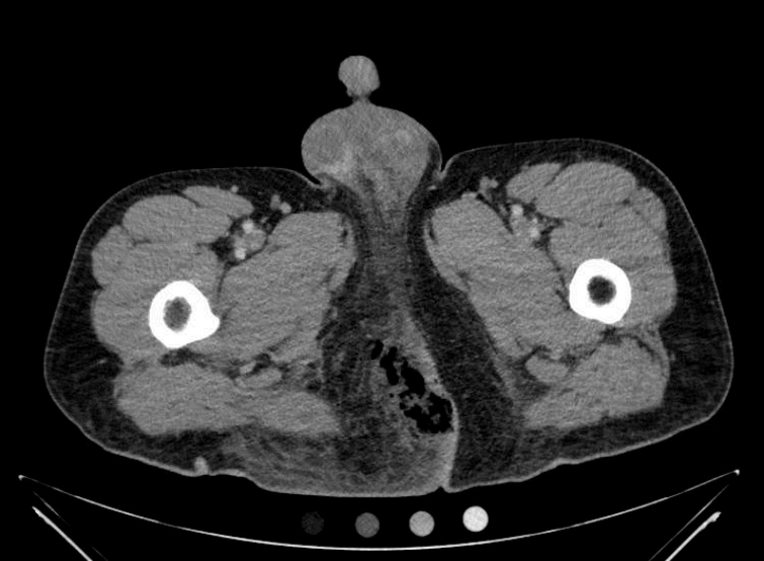 Fournier gangrene is typically seen in diabetic men aged 50-70. Other factors that predispose to Fournier’s is immunosuppression and alcoholism.1 The most common organisms isolated are Proteus, Klebsiella, Streptococcus,Staphylococcus, and E. coli.1 As seen in our patient, the most common source of spread is via perianal infections which are seen in 19%-50% of patients.2 Fournier gangrene can be life-threatening with a mortality rate ranging between 15%-50%.3 The classic exam finding of crepitus is only seen in 19%-64% of cases.4 Thus, while the diagnosis is often made clinically, further diagnosis with CT is preferred because it can show the source of infection and path of spread.5 CT is the modality of choice over ultrasound because it can detect fluid collections in the deep fascial planes, whereas direct pressure on the perineum with ultrasound is often not tolerated and cannot detect the small pockets of gas in tissues that CT does in patients with Fournier gangrene.5