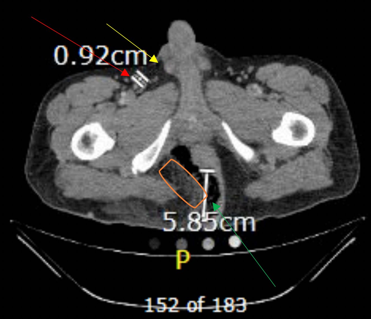 The computed tomography (CT) of the abdomen and pelvis revealed significant subcutaneous gas tracking along the perineum and right gluteal region (orange outline) into the scrotum with associated scrotal edema (yellow arrow) and subcutaneous inflammatory fat stranding of 0.92 cm (red arrow) consistent with Fournier’s gangrene. There is early fluid loculation along the right medial gluteal cleft of 5.85 cm (green arrow) without a sizeable drainable abscess seen.