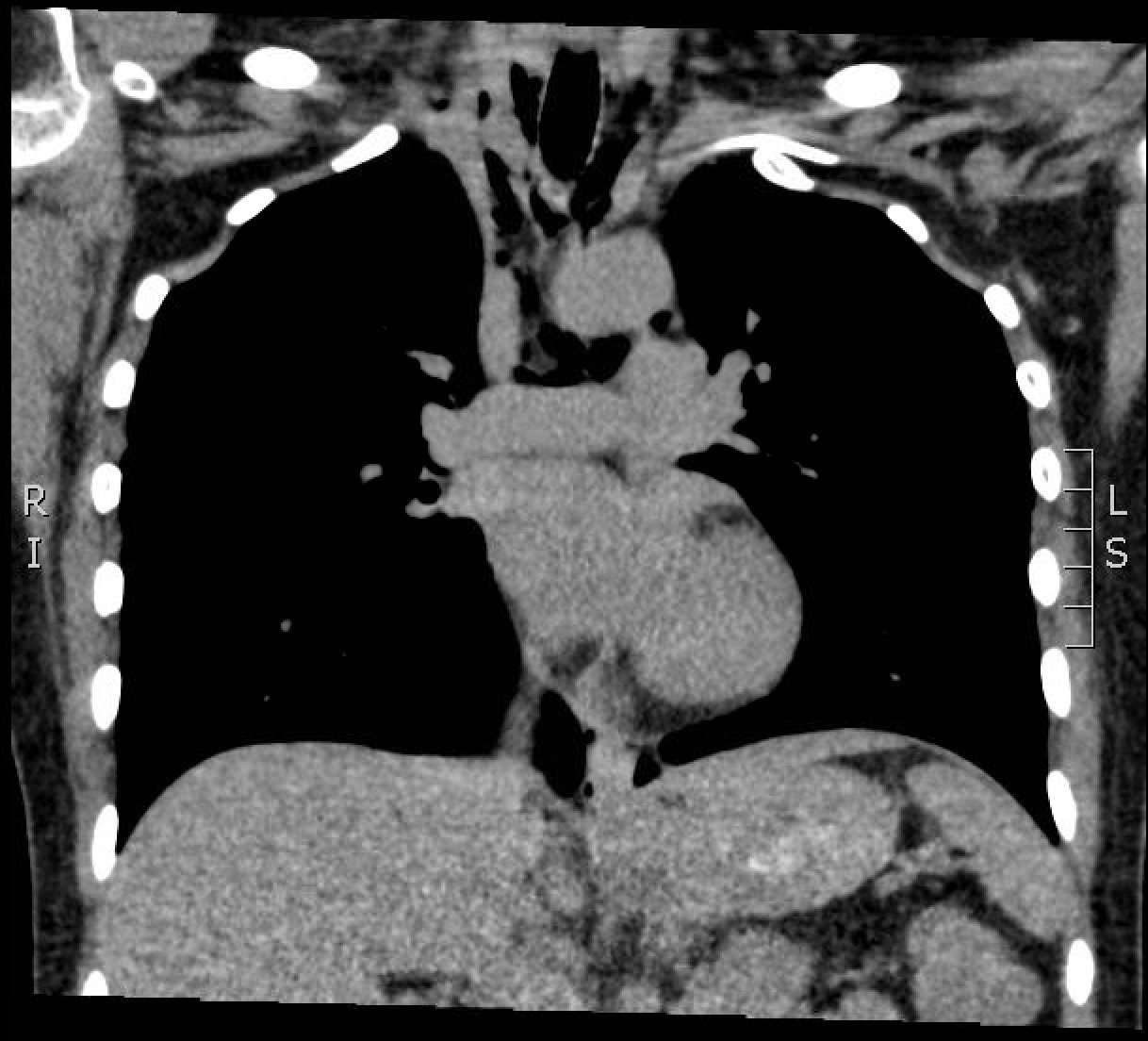 The thoracic CT scans showed extensive pneumomediastinum that tracked into the soft tissues of the neck, which given the history of vomiting also raised concern for esophageal perforation. There was still no evidence of mediastinal abscess or fat stranding. Additionally, a left subclavian vein port catheter, which terminates with tip at the cavoatrial junction of the superior vena cava can also be seen on the image.