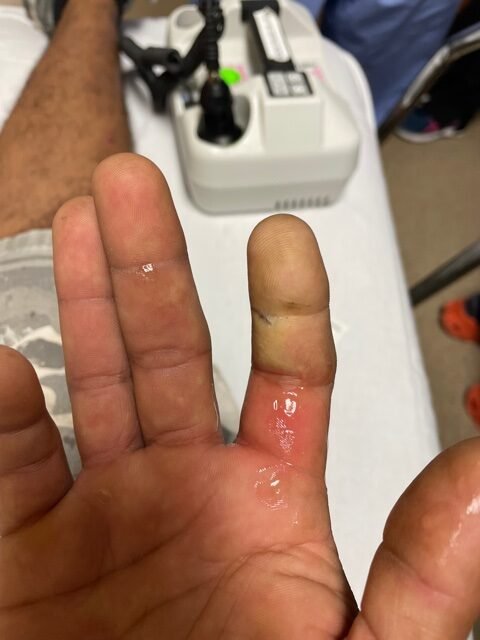 Despite the potential for significant morbidity with this injury, expedited evaluation and treatment in this case allowed for adequate retention of function in the affected digit, with only mildly decreased pincer function. In summary, the early mobilization of resources for patients with high-pressure injection injuries, especially early surgical consultation, is paramount to achieving positive outcomes.