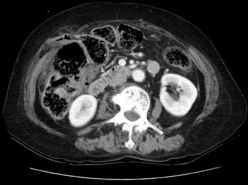 A 75-year-old female with a remote history of rectal cancer presented to the emergency department with acute right upper abdominal pain. The pain had begun suddenly after lunch. On review of systems, the patient had mild nausea. Initial vital signs were within normal limit. She denied fever, chills, or vomiting. The physical examination revealed a distended, tympanic abdomen with tenderness to palpation in the right upper quadrant. Laboratory examinations revealed a white-blood-cell count of 8.73 x 103 with 86% neutrophils. C-Reactive protein value was 1.17 mg/dL. She had a history of rectal cancer status post low anterior resection 14 years prior to this visit.