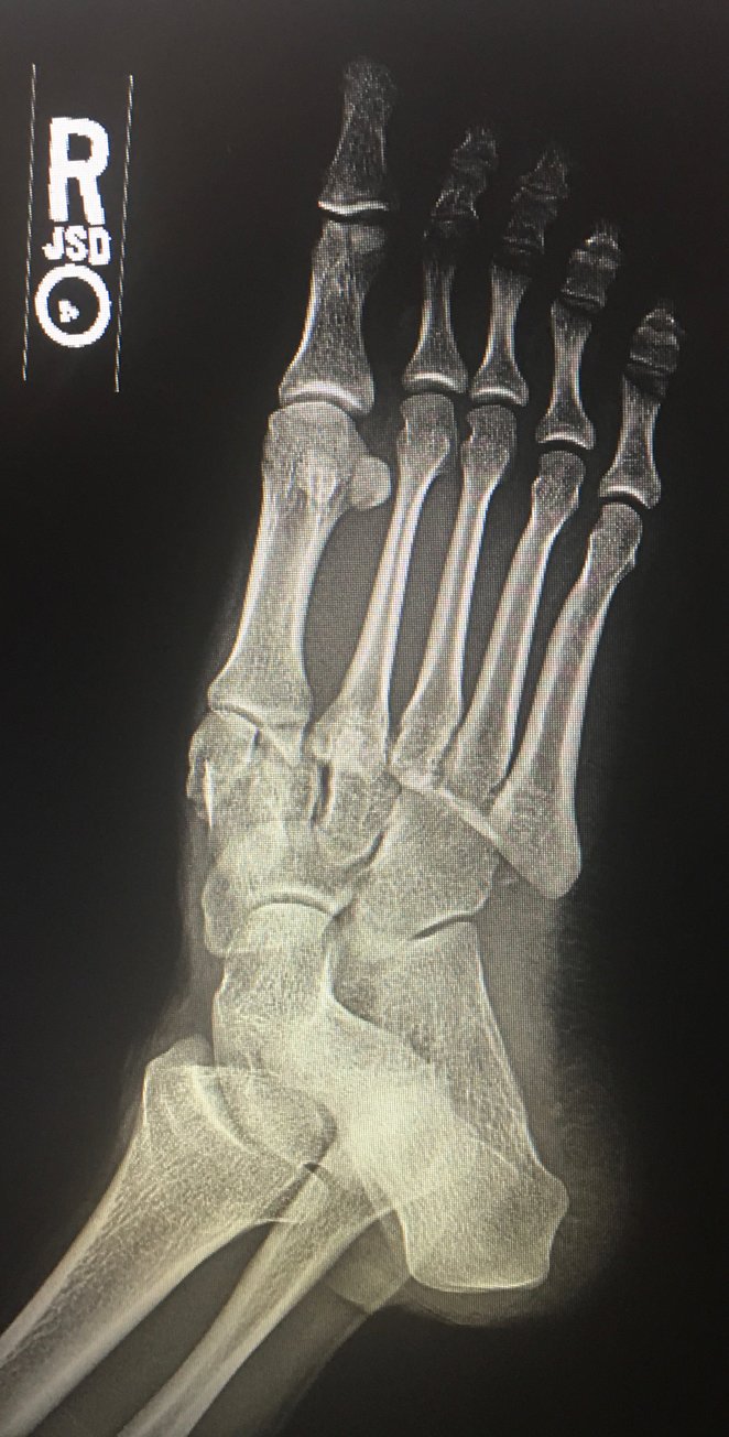 A 21-year-old male was brought in by ambulance to the emergency department status post motor vehicle accident. The patient was the restrained driver of a vehicle that struck a wall head-on at an unknown speed. His vitals were stable. The patient’s only complaint was severe pain to his right foot. On exam, the patient’s right foot was swollen and tender with deformity and was neurovascularly intact. Due to the unstable nature of the traumatic injury, the patient underwent urgent midfoot stabilization in the operating room.