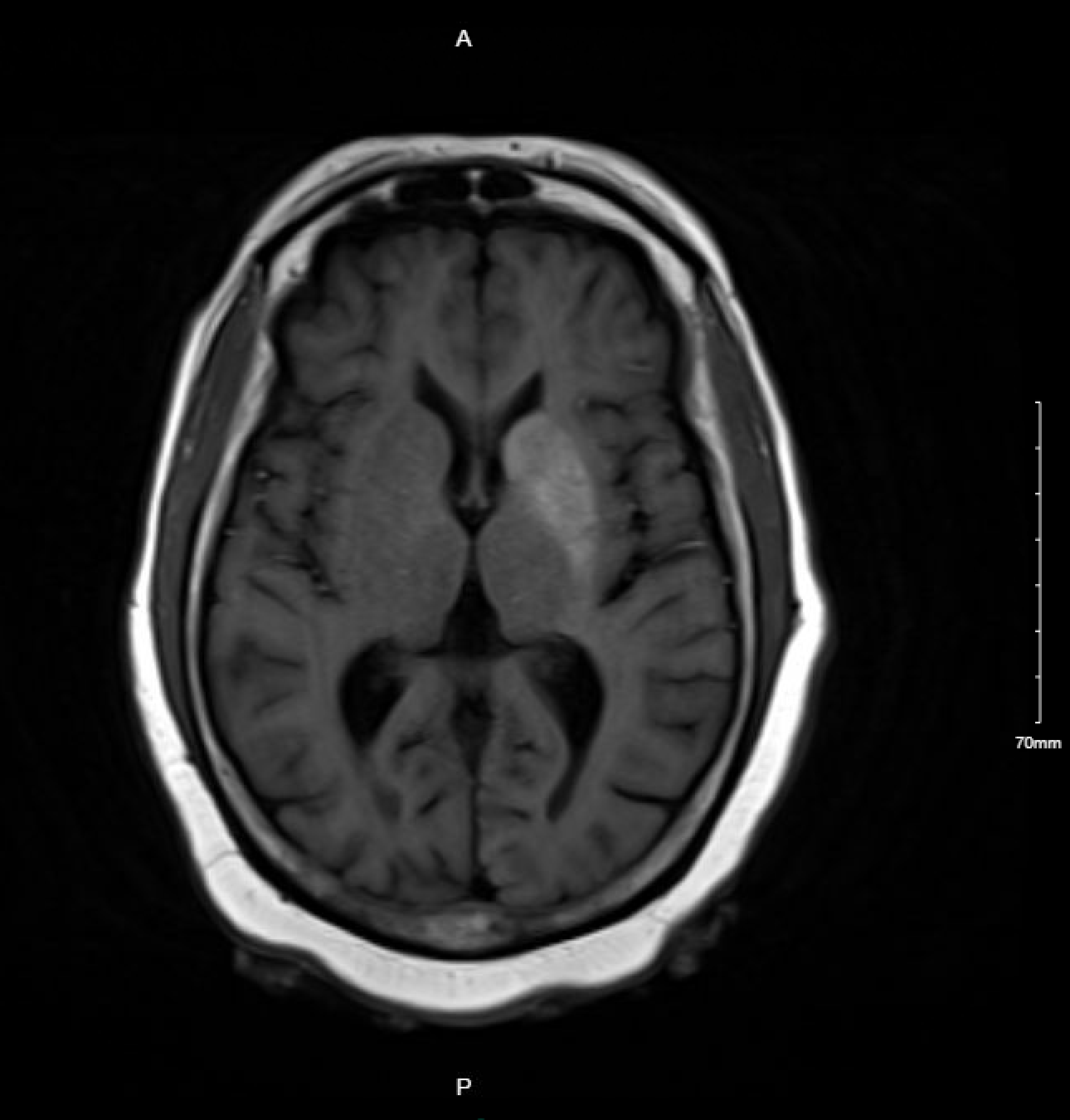 Nonketotic hyperglycemia hemichorea is a rare neurological manifestation associated with uncontrolled diabetes mellitus. This case report presents the clinical features, diagnostic workup, and management of a 74-year-old female with hemichorea secondary to nonketotic hyperglycemia. Patient presented to the emergency department with acute onset of right leg movement that was non-purposeful and random without any associated neurological symptoms such as paresthesias weakness, pain, or systemic symptoms. Patient’s medical history included untreated diabetes mellitus with glucose of 198 measured in the ED. Computed tomography of the and neck were unremarkable for any signs of ischemia, occlusion, hemorrhage or masses. Brain MRI without contrast showed T1 shortening within the left basal ganglia involving both the caudate nucleus and the lentiform nucleus, a radiologic finding common in nonketotic hyperglycemia hemichorea. Patient was admitted to the hospital for diabetes management. Patient’s symptoms did not completely resolve prior to discharge from the hospital but was closely monitored by her primary care doctor and neurologist; she had significant improvements in her symptoms over the subsequent year with improvement in her activities of daily living (ADLs).