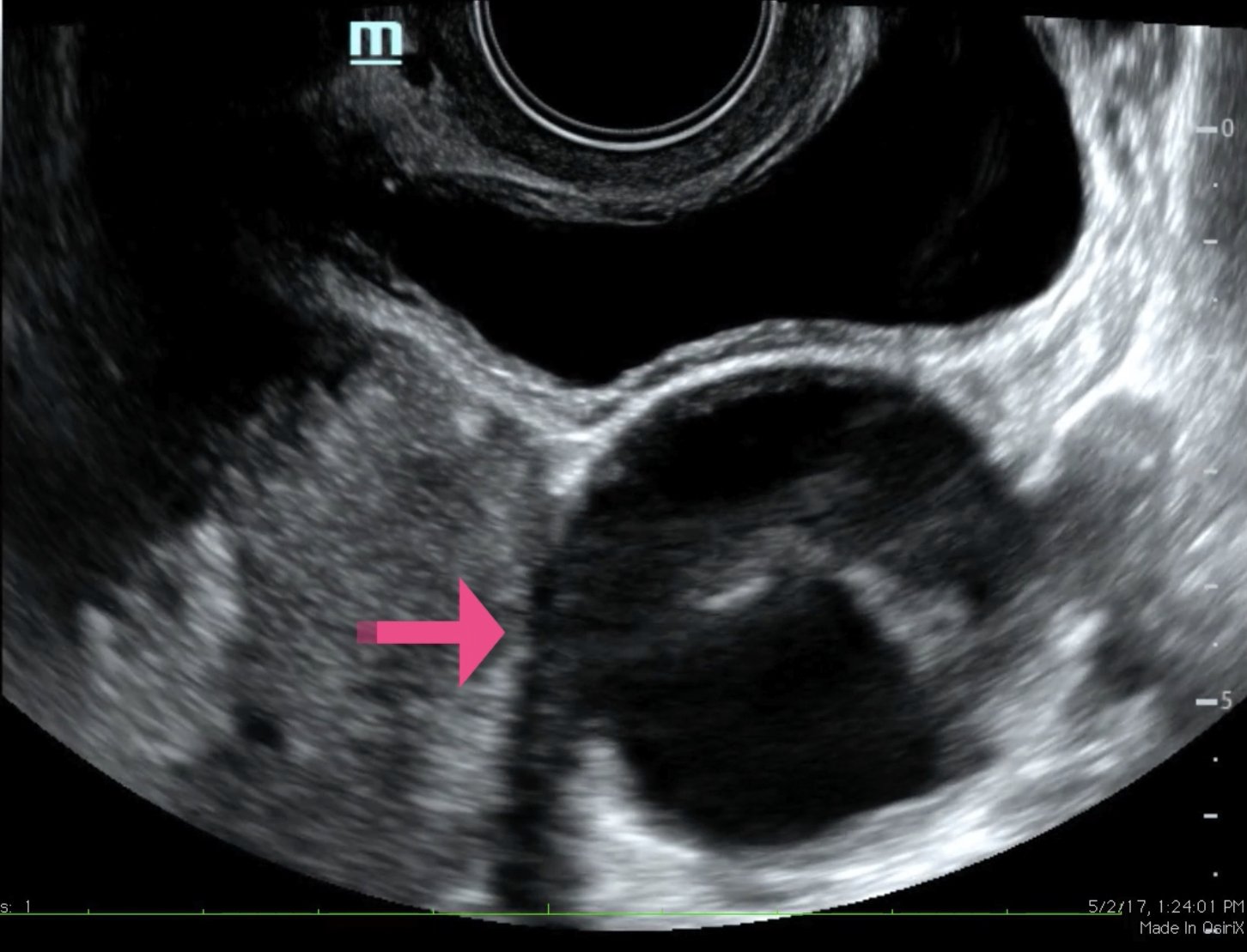 The ultrasound video clip demonstrates a transverse view of the pelvis using the endocavitary probe. The bladder can be seen on the anterior portion of the scan (yellow arrow), while the uterus with an intrauterine pregnancy is visible posteriorly (blue arrow). The thickened appearance of the uterine wall is also indicative of pregnancy. A large, anechoic cystic structure measuring approximately 5 cm is seen in the vicinity of the patient’s left adnexa (pink arrow), which raises concerns for ovarian torsion.1