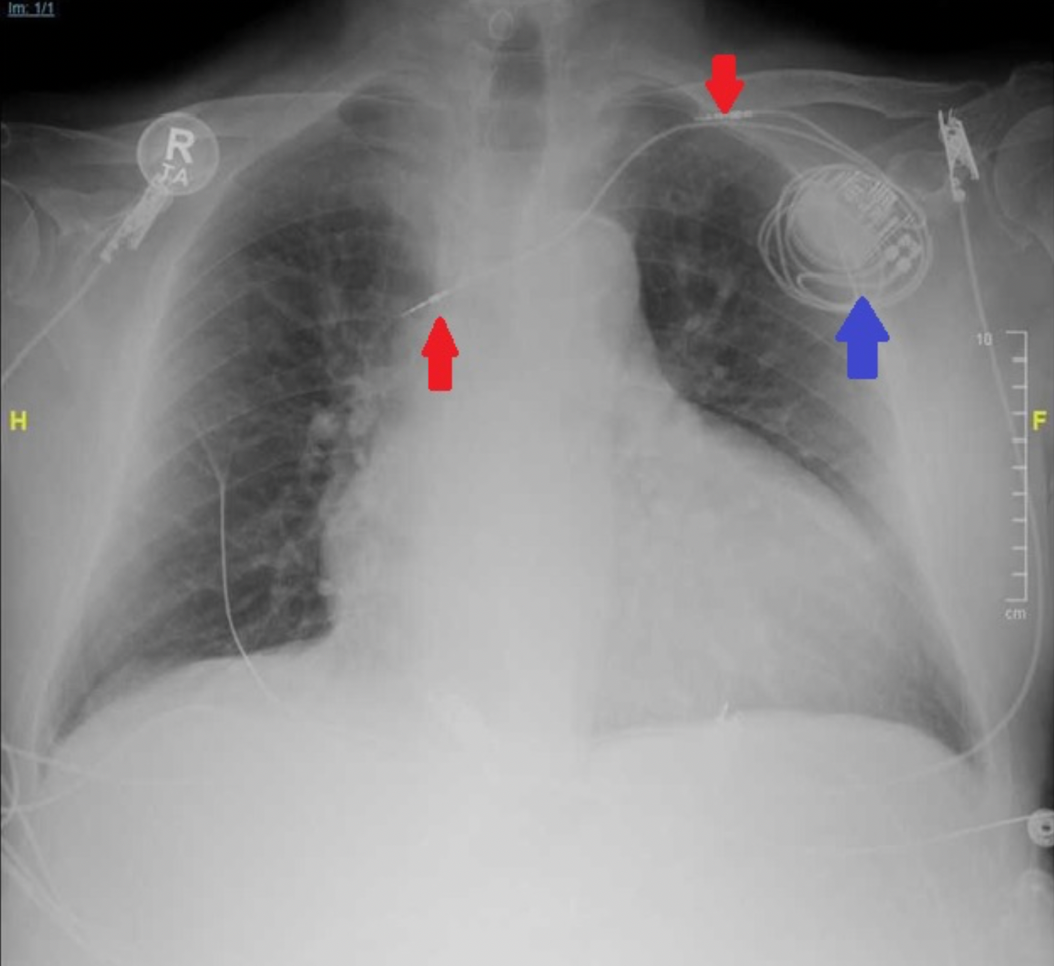 The ECG demonstrated the presence of pacemaker spikes without appropriate capture (green arrows) and a ventricular escape rhythm which can be identified by an absence of P waves prior to the QRS complex (purple arrows). The portable chest X- demonstrated displaced pacemaker leads (red arrows) that were coiled around the pulse generator (blue arrow).