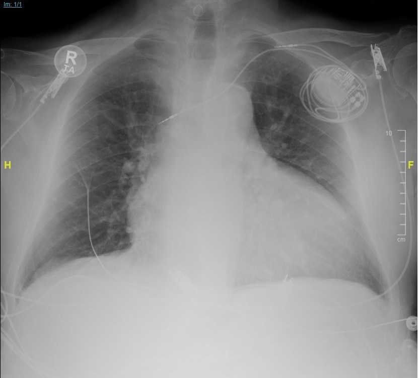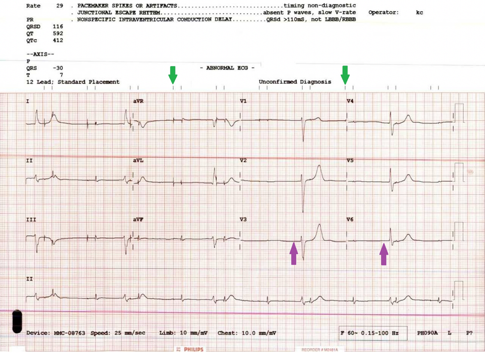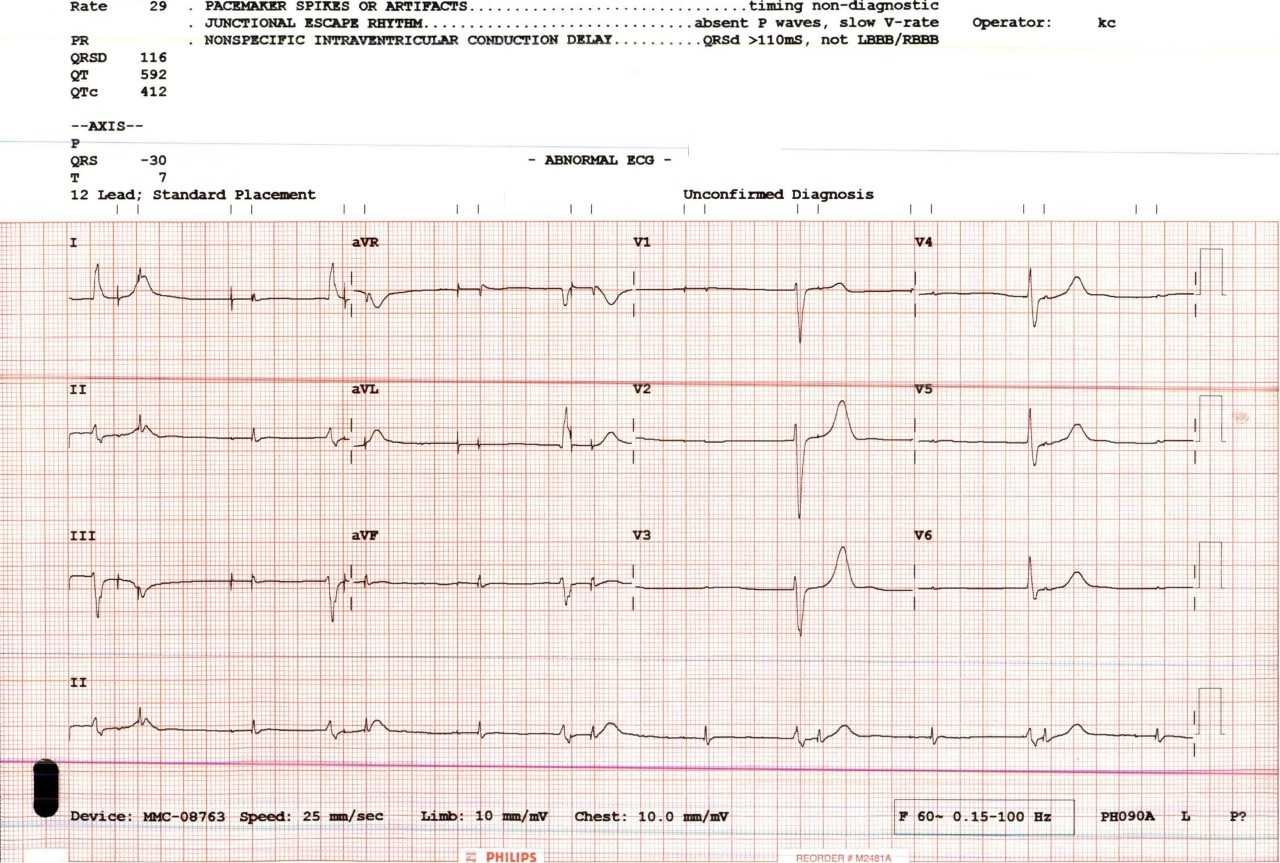 The patient’s chief complaint as documented by the triage nurse was “abdominal pain.” An electrocardiogram (ECG) order was automatically triggered by the ED electronic medical record system due to his age and chief complaint. The vital signs obtained in triage demonstrated a pulse in the 30’s and a systolic blood pressure in the low 100’s. The ECG was reviewed by the resident and attending physician, and he was placed on an external pacer. A portable chest X-ray was ordered.