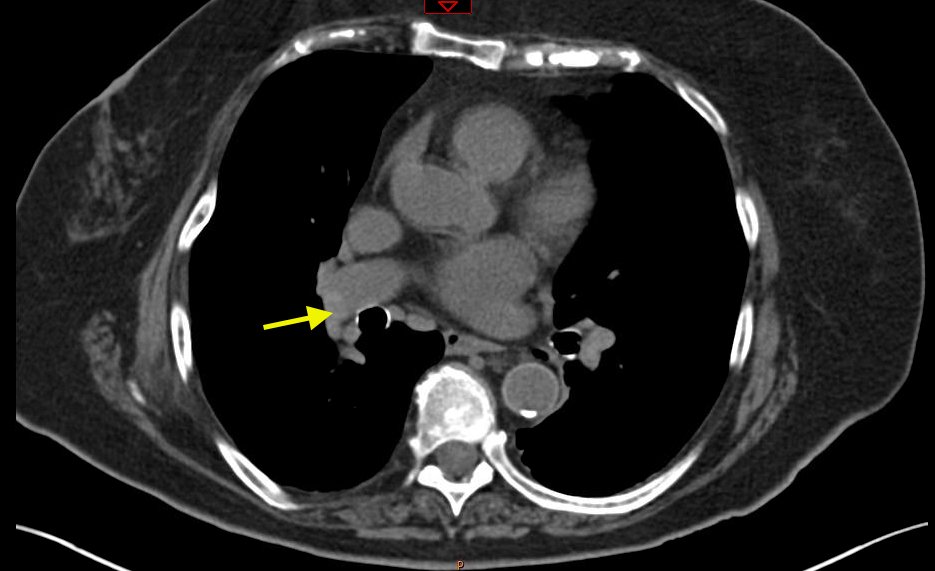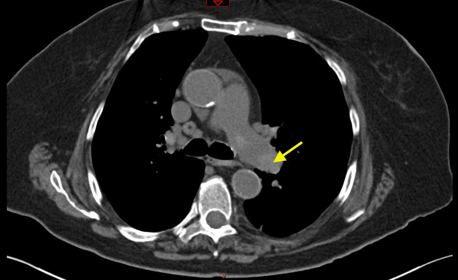A 91-year-old female with a history of deep venous thrombosis presented to a rural Emergency Department with symptoms of dyspnea and chest pain radiating towards her back. She was not on anticoagulation secondary to fall concerns. A chest radiograph revealed only a widened mediastinum. Intravenous contrast could not be administered secondary to decreased renal function; ventilation perfusion scanning was not available. A CT scan of the chest was performed without contrast to evaluate the patient’s dyspnea and widened mediastinum.