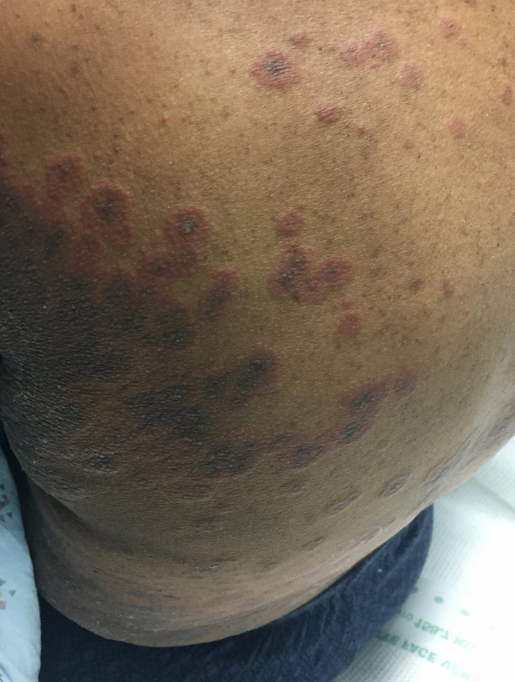Physical exam findings were significant for 1-3 cm diameter well-demarcated superficial ulcers on the patient’s abdomen and extremities, with mucosal sparing. Several small tense bullae were present on the bilateral inner thighs and numerous small reddish plaques were scattered over the patient’s back. Nikolsky’s sign was negative. No lymphadenopathy was noted.