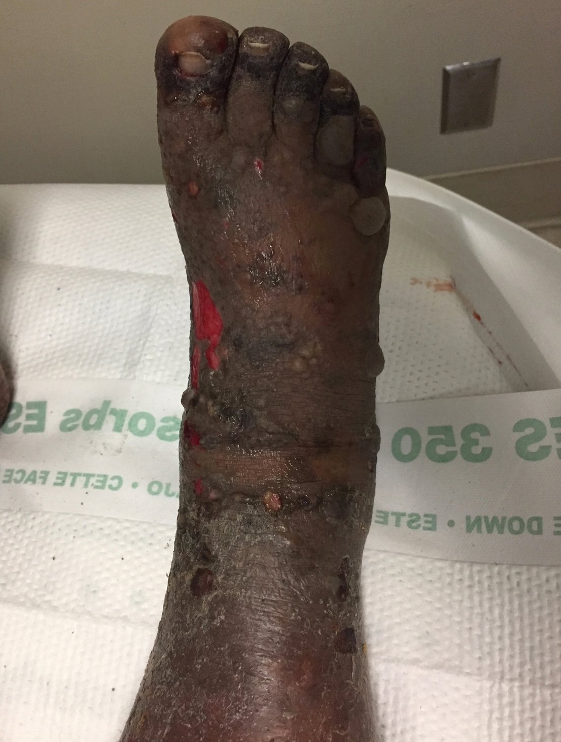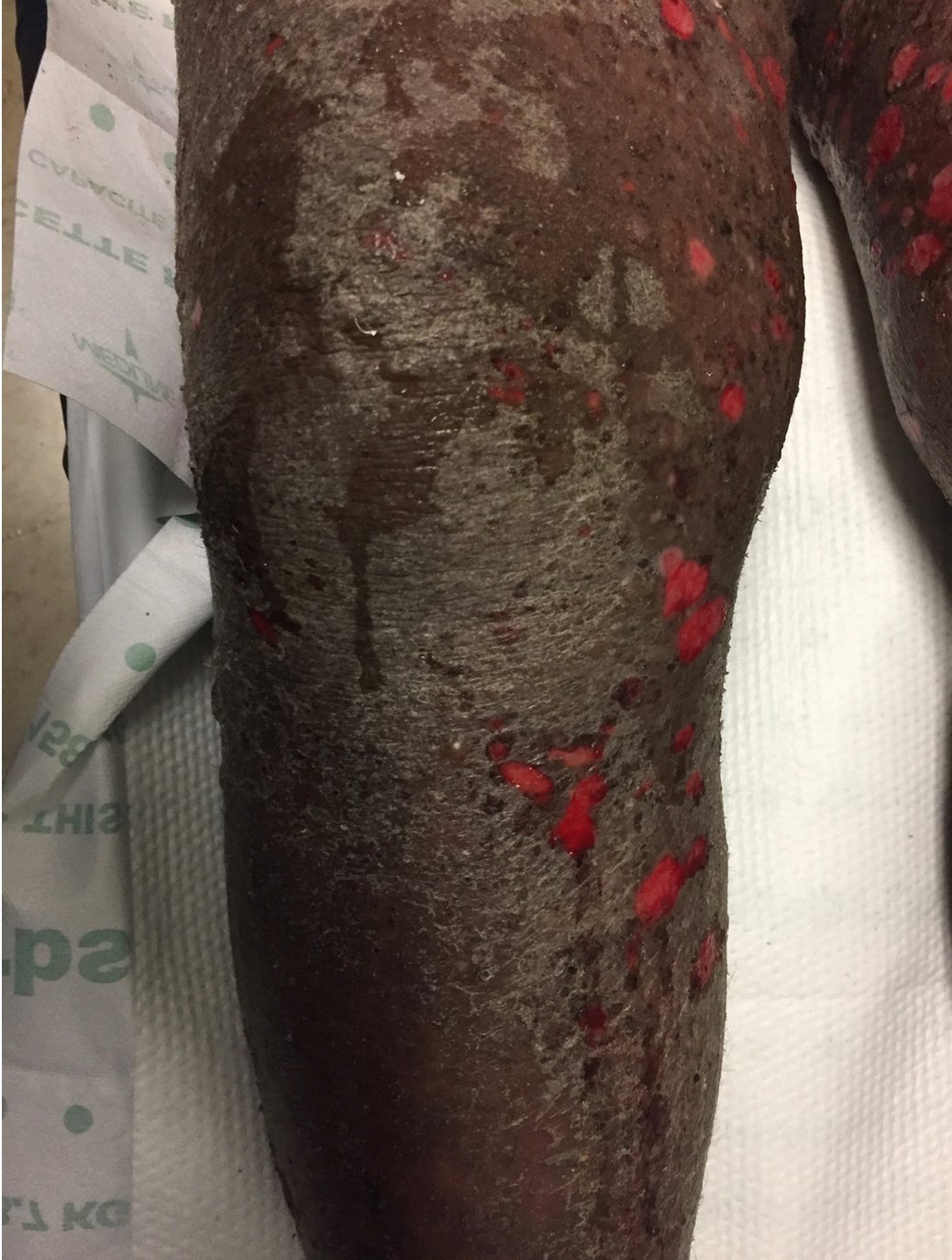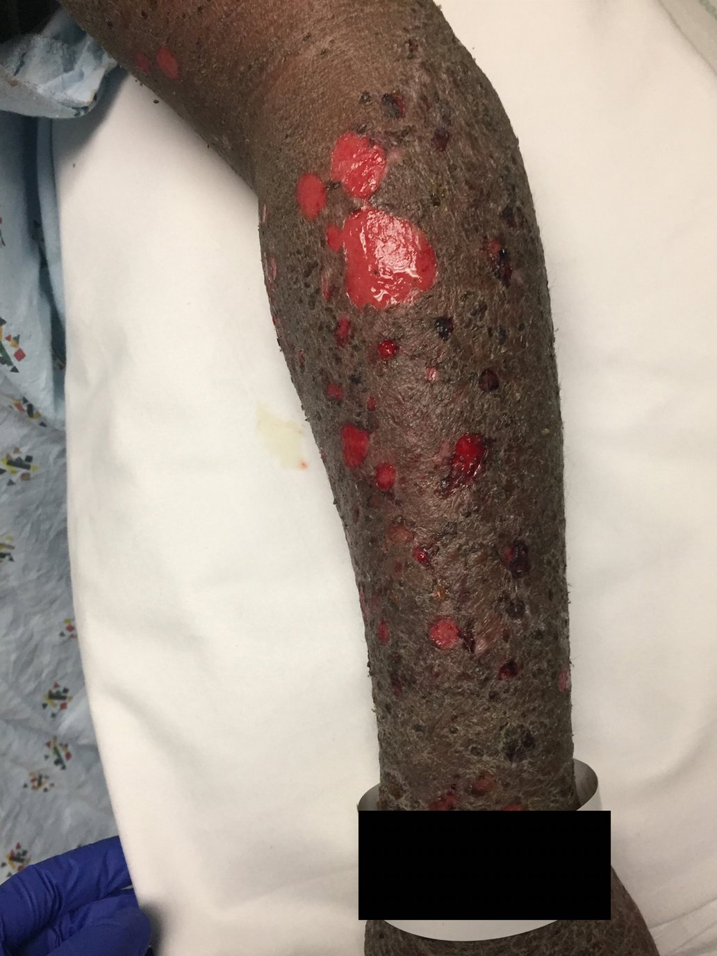 A 40-year-old female presented to the emergency department reporting a pruritic pustular rash that began on her abdomen five weeks prior. Since onset, the rash spread to her extremities, chest, and face. At presentation, she was three weeks post-partum and reported subsequent worsening of the rash, with the development of blisters on her abdomen and extremities immediately following her delivery.