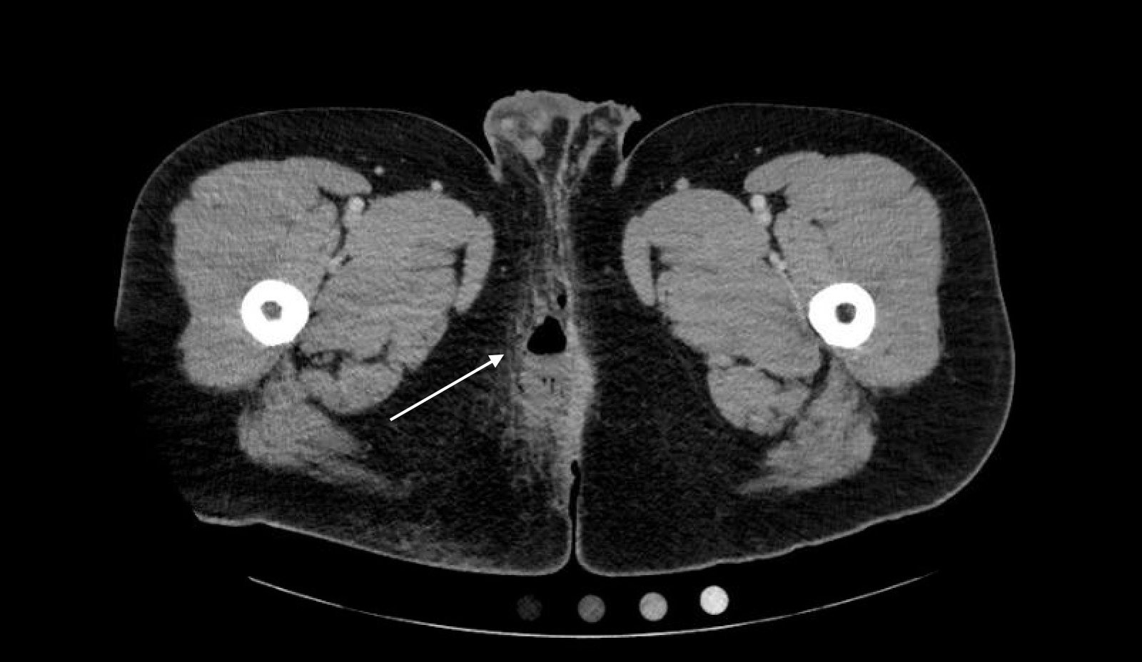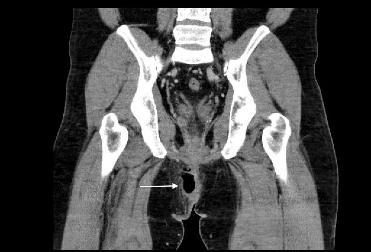 Computed tomography (CT) of the Pelvis with intravenous (IV) contrast revealed a 5.7 cm x 2.4 cm air-fluid collection in the right perianal soft tissue along the right gluteal cleft, with surrounding fat stranding, consistent with a perianal abscess with cellulitis.