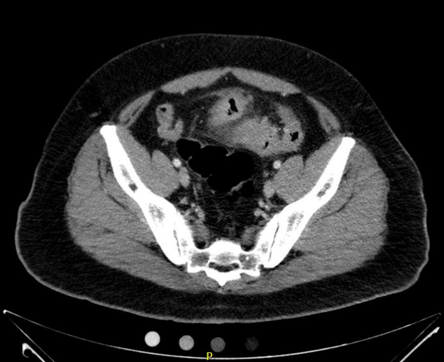 A previously healthy 39-year-old male presented to the emergency department with six weeks of suprapubic pain and dysuria. He also reported passing air with his urine over the last several days. The patient was afebrile with otherwise unremarkable vital signs. Of note, he had two prior urgent care visits where he was diagnosed with simple urinary tract infections (UTIs) and subsequently prostatitis, both of which have not resolved with two separate courses of antibiotics. His exam was significant for mild suprapubic tenderness, without rebound or guarding, and an unremarkable genitourinary exam of a circumcised male. Laboratories were significant for an abnormal urinalysis, indicating infection. Given his history of persistent symptoms despite antibiotics, the infrequency of UTIs in healthy adult circumcised males, and the presence of pneumaturia, a computed tomography (CT) scan of the abdomen and pelvis was ordered.