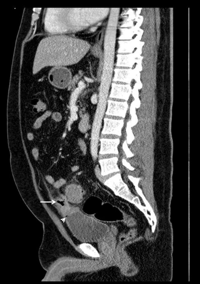 A CT scan of his abdomen/pelvis shows acute sigmoid colonic diverticulitis with adjacent extraluminal collection containing gas (axial view, white arrow) consistent with perforation, along with abutment of the urinary bladder with intraluminal bladder gas (sagittal and coronal views, white arrowheads) suggesting colovesicalfistula.