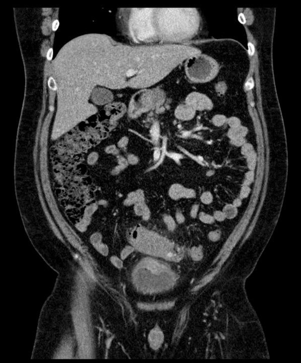 A colovesicalfistula (CVF) is an abnormal connection between the colon and urinary bladder.1 Although uncommon, CVFs can cause significant morbidity and may lead to death, usually secondary to urosepsis.1,2 These fistulas are most commonly complications of diverticular disease, inflammatory bowel disease, or cancer.3 Up to 20% of patients with diverticular disease and up to 1% of patients with Crohn’s disease are found to have a fistula.4,5 Pneumaturia or fecaluria can be seen in up to 90% of patients.6 Other presenting signs/symptoms include dysuria, suprapubic pain, frequency, urgency, and rarely, gross hematuria.3 The diagnosis of a colovesicalfistula is confirmed by abdominopelvic CT scan with oral or rectal contrast demonstrating air or contrast material in the bladder with adjacent colon and bladder wall thickening. This type of diagnostic imaging has been shown to have a sensitivity of 90 to 100 percent.3