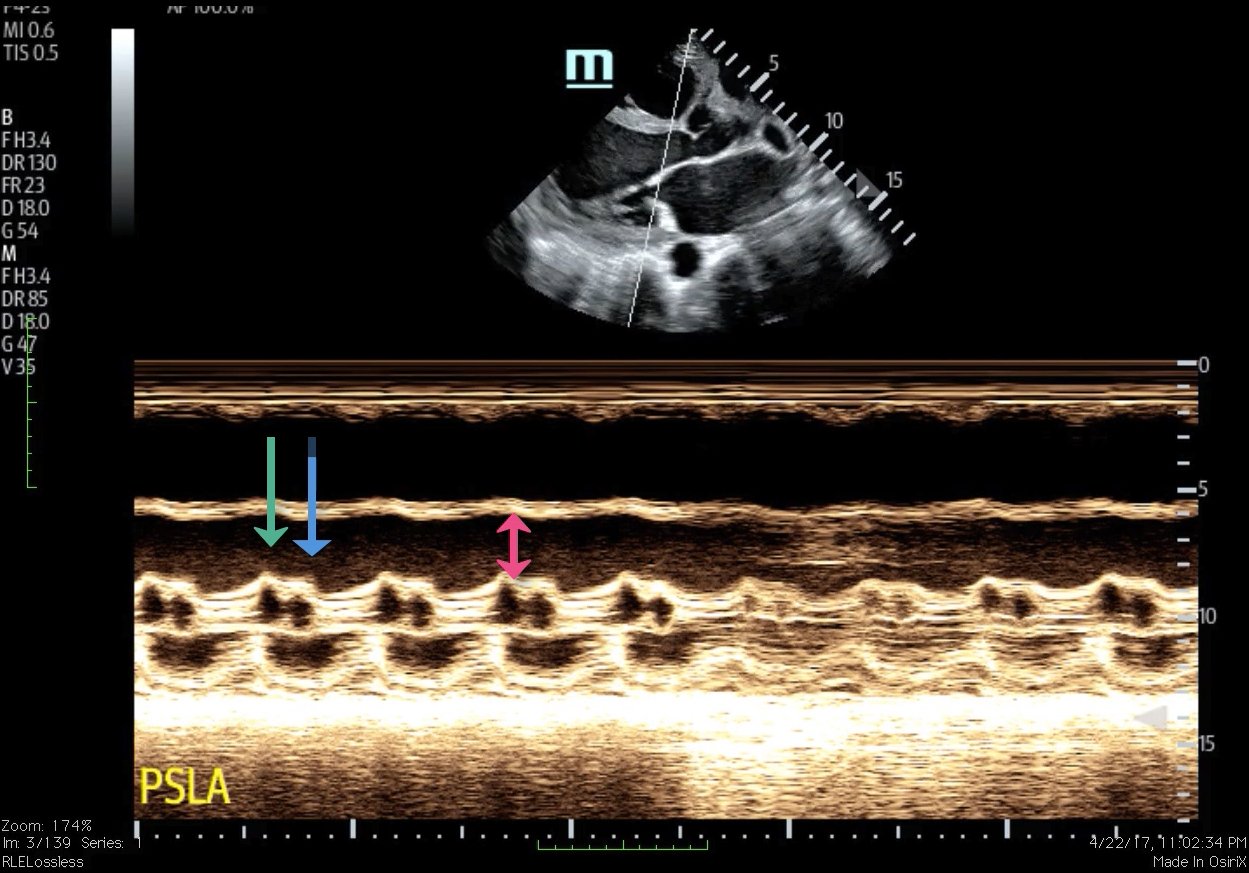 Bedside ultrasound with the phased array probe was used to obtain a parasternal long axis view which demonstrated poor contractility and a severely decreased ejection fraction (EF). M-mode was placed over the anterior leaflet of the mitral valve to create a tracing depicting both the E-wave of early diastole (green arrow) and the A-wave from the atrial kick (blue arrow). The shortest distance between the septum and the mitral valve on the M-mode tracing gives the patient’s E-Point Septal Separation (EPSS) (pink arrow). EF can be estimated using the formula EF=75.5-2.5 x EPSS (in mm). This patient’s EPSS was measured to be 20mm which estimates that she had an EF of 25.5%.