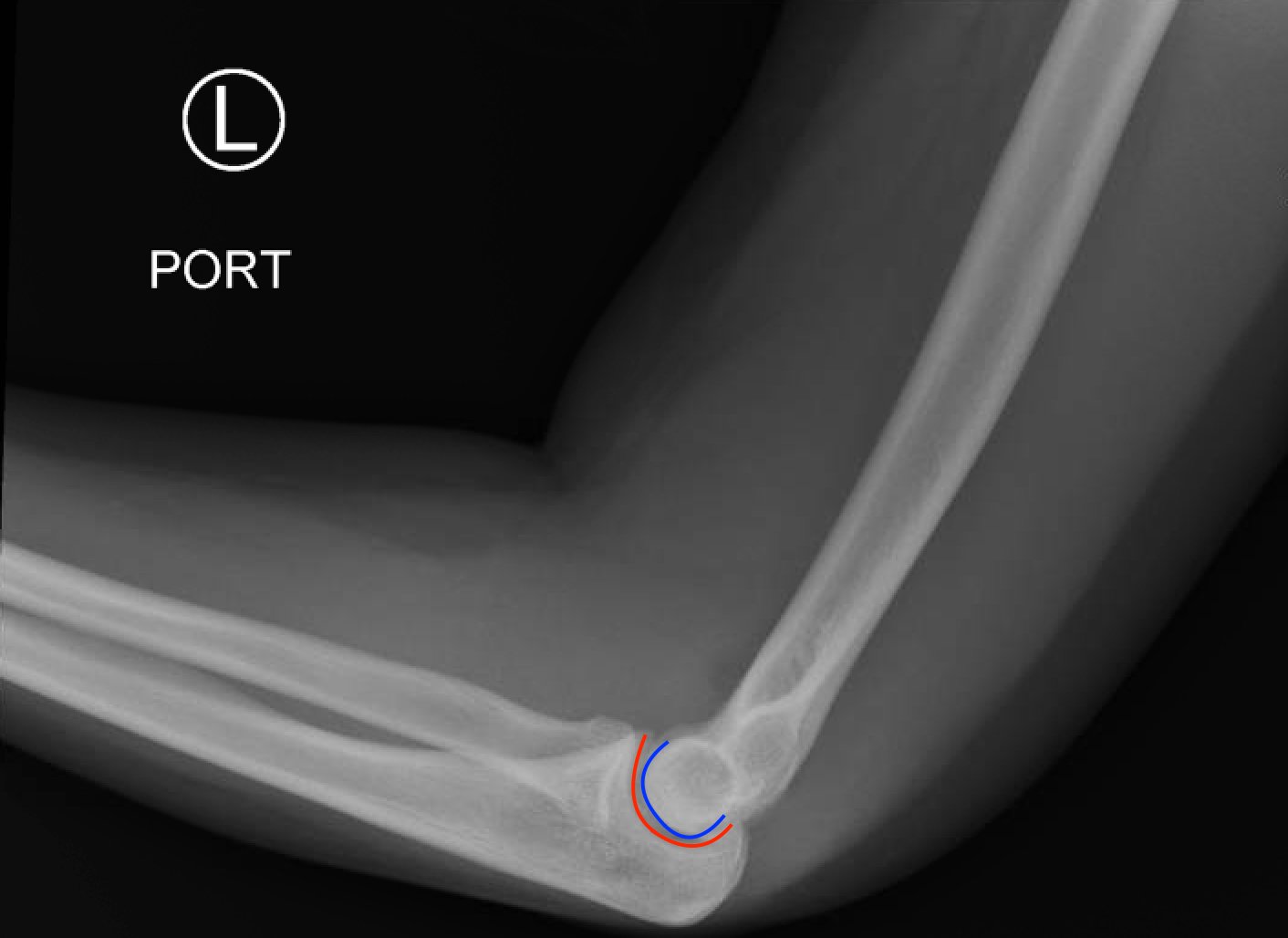A 15-year old female presented with left elbow pain. While competing in a high school wrestling match, she extended her left arm to brace a fall and had immediate onset of sharp pain. She denied weakness or numbness of her left arm. She had no past medical history.