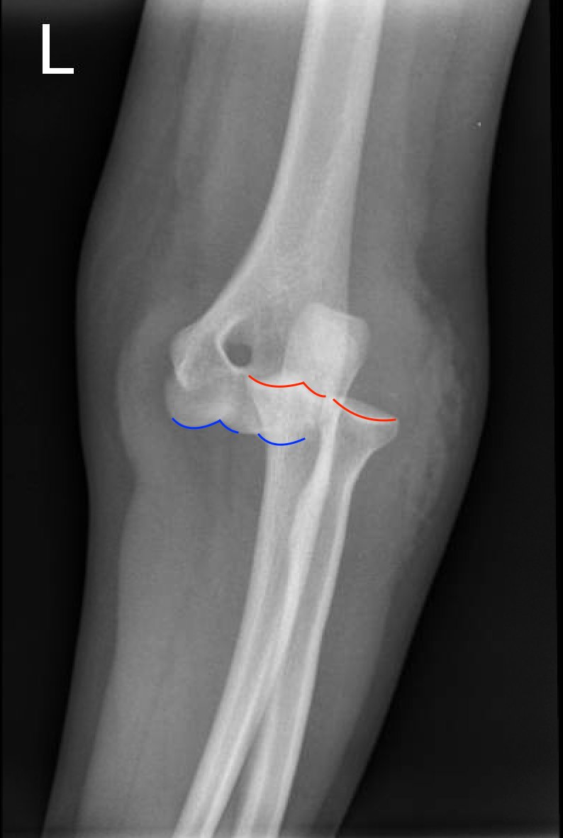 Posterior Elbow Dislocation, Oblique XRay, dislocated. JETem 2016