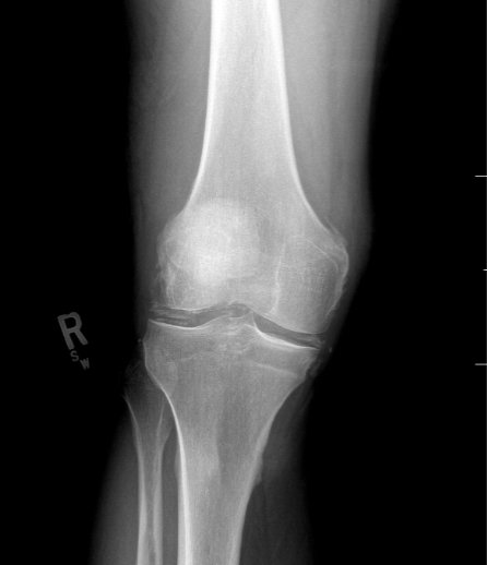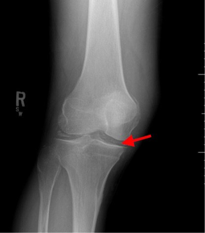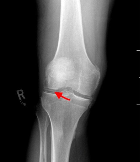 Radiographs of the knee showed multiple radio-dense lines paralleling the articular surface (see red arrows) consistent with calcium pyrophosphate crystal deposition within the joint often seen in calcium pyrophosphate disease (CPPD) also known as pseudogout.