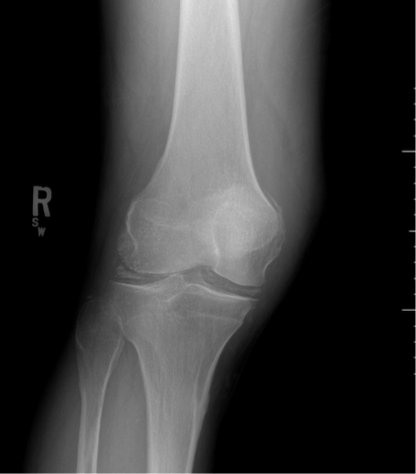 A 53-year-old male presented with worsening right knee pain and swelling over the past 48 hours. He denied recent trauma to the knee, history of IV drug use, and recent illness. He had no history of diabetes, immunodeficiency, chronic steroids, rheumatologic disease, or knee replacement. He described the pain as sharp, non-radiating, and worse with movement. He was unable to walk due to pain.