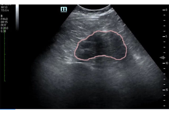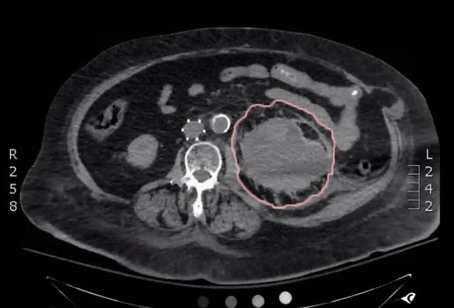 Bedside ultrasound was performed and demonstrated a hypoechoic area within the left kidney (images not shown). The non-contrast computed tomography (CT) of the abdomen and pelvis shows a significantly enlarged left kidney and a region of high-attenuation encapsulating the left kidney, concerning for acute hemorrhage.