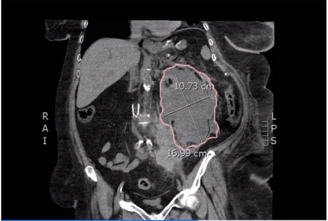 A 58-year-old female with history of thrombotic disorder presented to emergency department (ED) with constant, sharp pain in her lower abdomen radiating to her back for the past day. She denied nausea, vomiting, changes in bowel habits, or recent abdominal trauma. The patient had been recently transitioned from warfarin to enoxaparin after having a shoulder surgery one week prior to her presentation. On exam, the patient was tachycardic, hypotensive, and pale. She had significant abdominal tenderness to the left upper and lower quadrants, and left flank. Her initial hemoglobin (Hbg) was 8.9 g/dL, but dropped to 6.1 g/dL during her ED course, requiring emergent blood transfusion.