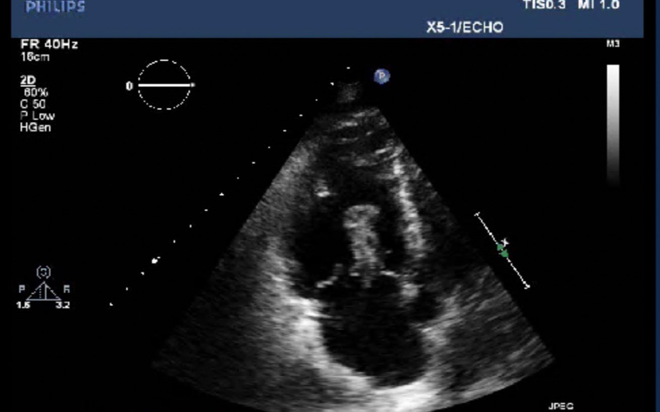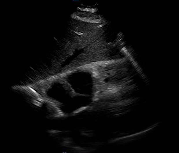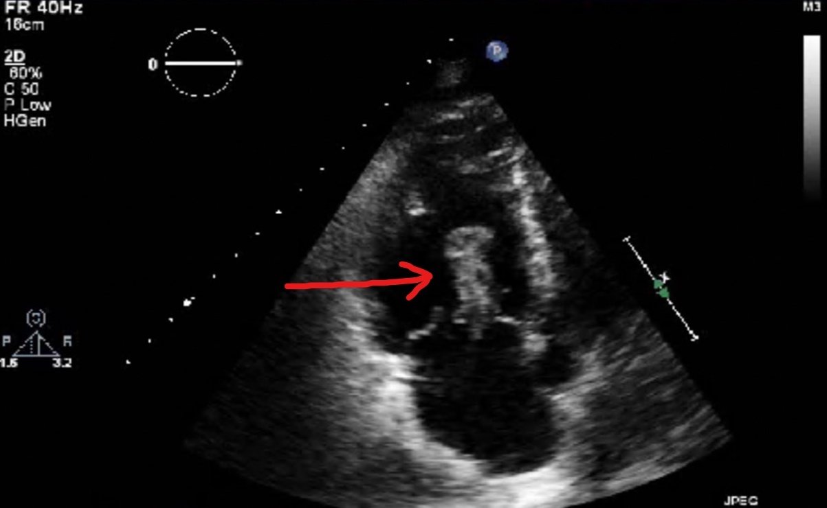 Right atrial thrombus is a rare finding that is almost exclusively found complicating pulmonary thromboembolism1 and carries a high mortality rate from 27%1 to 44%.2 Typically the diagnosis is made via echocardiogram, with the sub-xiphoid view most likely to provide adequate views of the right atrium. The sub-xiphoid view is obtained by using the left lobe of the liver as an acoustic window, with the probe angled cephalad toward the thorax. Treatment strategies for right atrial thrombus include anticoagulation, surgical thrombectomy, or thrombolytic therapy. At this time there are no evidenced-based guidelines to direct treatment strategy; however, the largest retrospective analysis shows significantly increased survival with thrombolysis, having a mortality rate of 11.3%, in comparison to 28.6% with anticoagulation and 23.8% with surgical thrombectomy.3 Another study reports that hypotension and pulmonary embolism severity predicts mortality risk in the setting of right heart thrombi, but not the size, shape, or mobility of the thrombus on echocardiogram.4