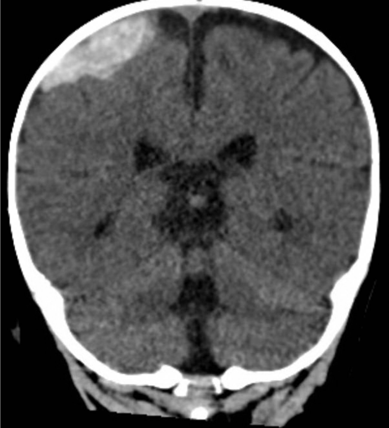 Given the concern for non-accidental trauma in this nonmobile child with no history of trauma, pediatric surgery and neurosurgery were consulted and further bloodwork was obtained, revealing elevated partial thromboplastin time (PTT) and a normal prothrombin time (PT). Further work-up led to a diagnosis of severe hemophilia A. He was managed non-operatively with factor VIII infusions to achieve normal factor levels. He remained neurologically stable without further seizure activity during his hospitalization. A skeletal survey showed no fractures. He received levetiracetam for 6 months and had no neurological deficits.