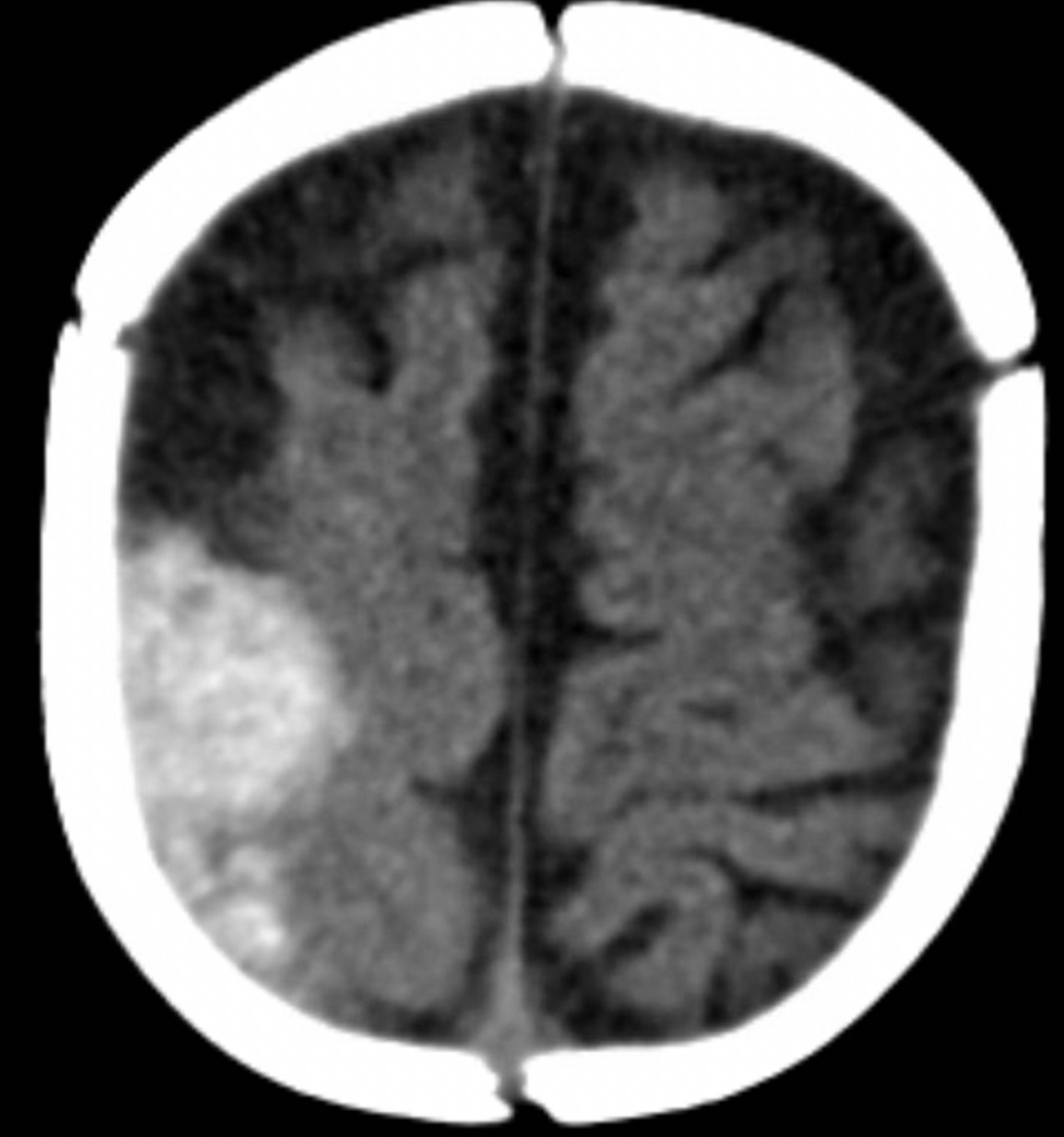 A 5-month-old male born full-term presented with fever to 102.3°F and an episode of left arm stiffening and shaking with blinking. The episode lasted 45 minutes after which it spontaneously resolved. Review of symptoms was negative for poor feeding, vomiting or trauma. His medical history was negative for bleeding disorders, easy bruising, or seizures. Family history was noncontributory. Vital signs were normal. He had a witnessed 3-minute focal seizure with rhythmic jerking of his left arm and lip-smacking during the examination. He lacked clonus or cranial nerve anomalies; his tone and deep tendon reflexes were normal. He had no cutaneous stigmata. He had no bruising, swelling, or tenderness to palpation over his head or body.