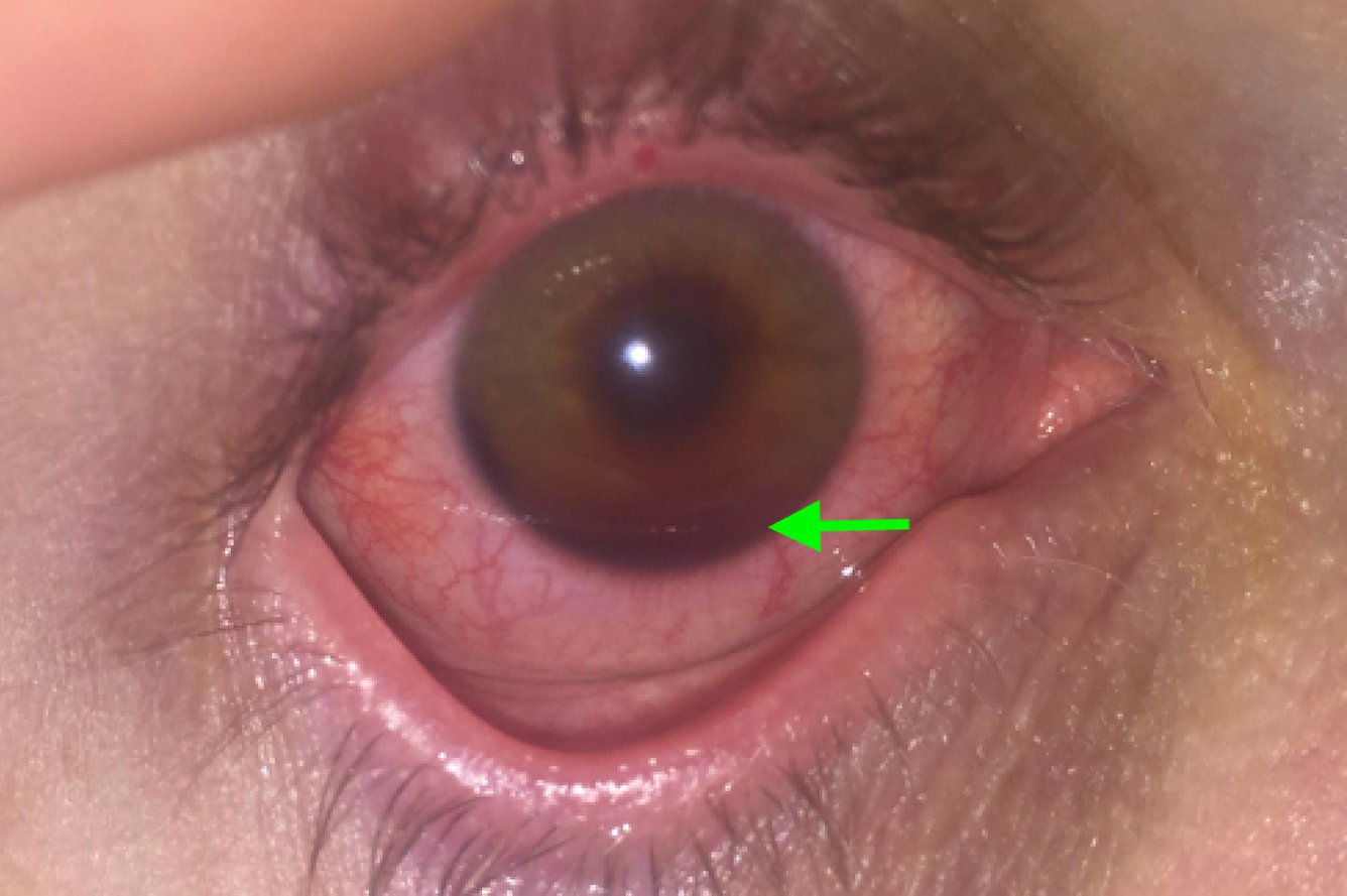 Upon initial evaluation, the patient had an obvious hyphema in the right eye with associated conjunctival injection. Initially, the bleeding in the anterior chamber was cloudy just above the level of the pupil (yellow arrow), appearing to possibly be a grade II hyphema. There were no other signs of trauma to the eye under Wood’s lamp examination with fluorescein staining. The globe was intact. Intraocular pressure in the affected eye was 19 mmHg and 15 mmHg in the unaffected eye. Extraocular movements were full and intact. The pupil was 4 mm round and reactive to direct and consensual light. Visual acuity was greater than 20/200 in the affected eye compared to 20/25 in the unaffected eye. After an observation period of two hours, with the patient remaining upright, the hyphema had settled down to a rim in the lower anterior chamber (green arrow), a grade I hyphema.