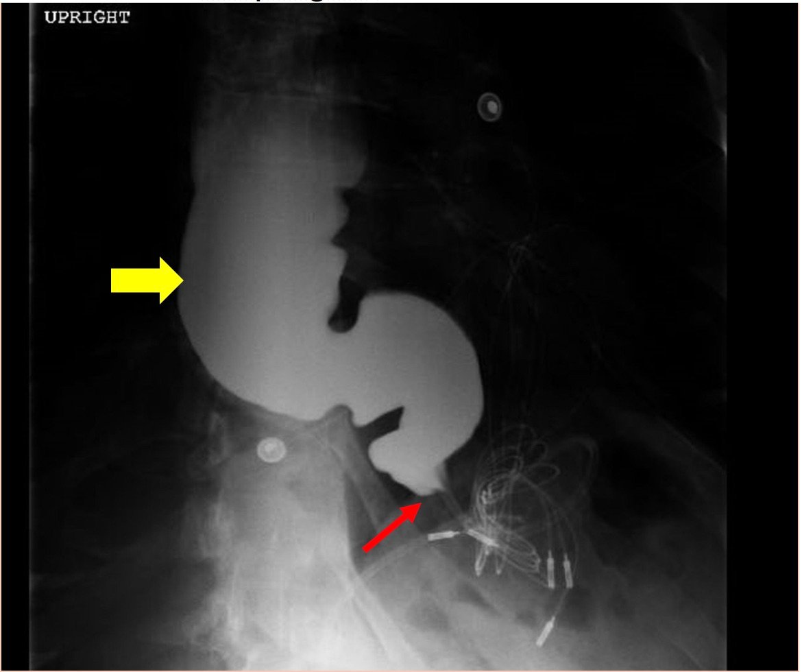 Achalasia is a rare (prevalence ~0.3-9.5/100,000, increasing with age) digestive disorder characterized by denervation to the distal esophagus, promoting regional aperistalsis and tonic contraction of the LES.1-3 Achalasia most commonly presents as acute, simultaneous dysphagia to both solids and liquids, but can present as heartburn, regurgitation, or even unexplained cough.1-3 A dilated esophagus with narrowing at the LES (“Bird’s Beak Sign”) and delayed esophageal emptying on barium esophagram are pathognomonic for achalasia (sensitivity 90%, specificity 95%),4 as is distal aperistalsis with increased resting LES tone on high-resolution manometry (sensitivity 98%, specificity 96%).5 Pharmacologic LES relaxation may be trialed, but surgical myotomy is usually necessary.1,2,3,6 Our patient underwent laparoscopic Heller myotomy resulting in a dilated, aperistaltic esophagus with no evidence of obstruction and is being followed for continued GERD and dysphagia.