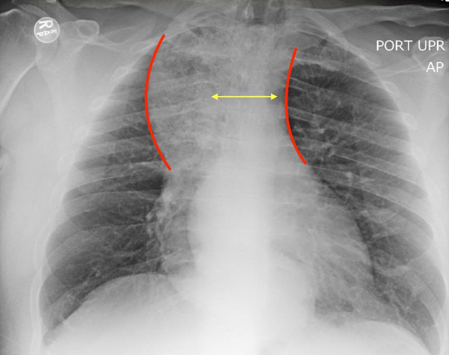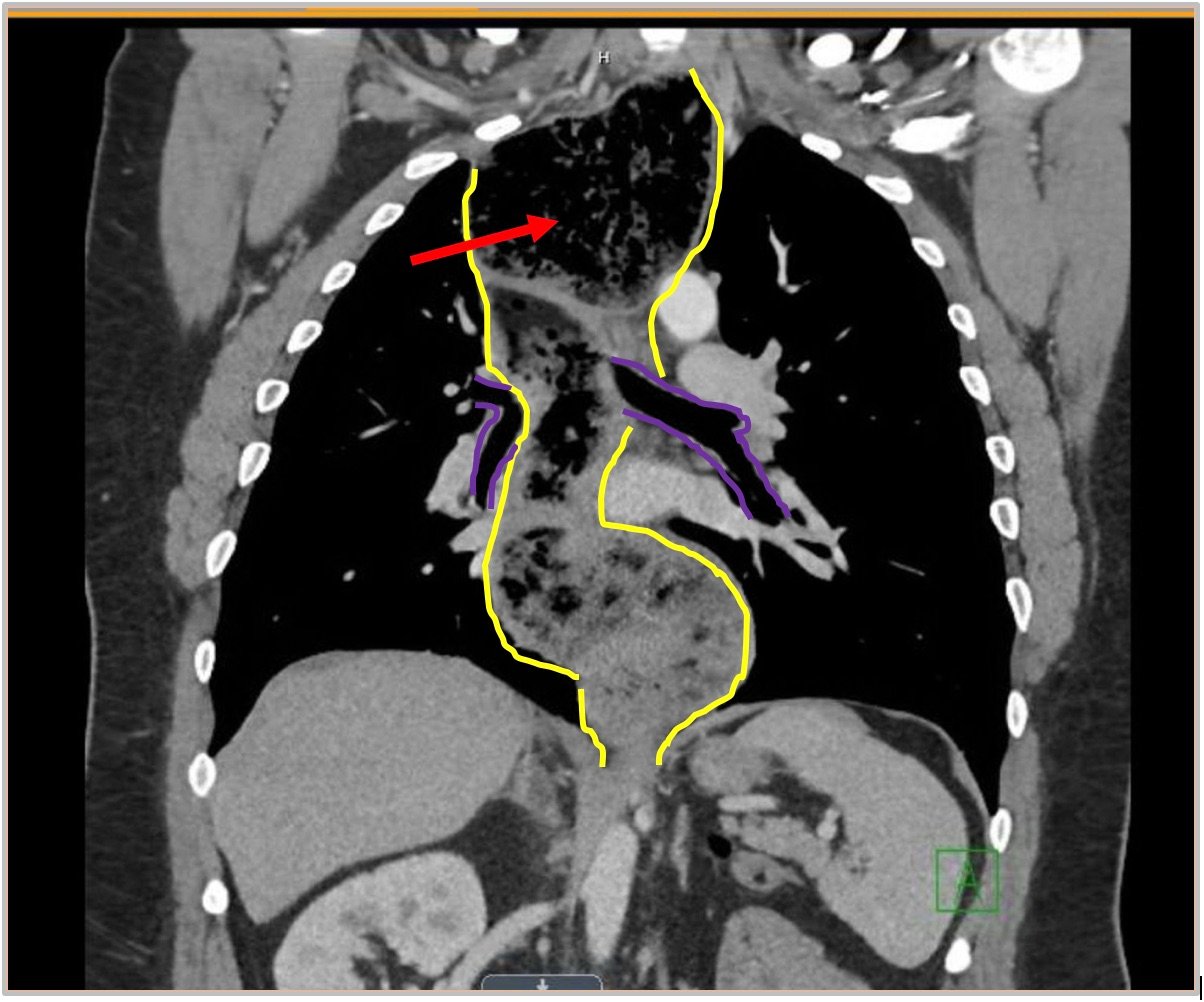 The chest X-ray demonstrated a markedly widened mediastinum (red brackets), raising concern for thoracic aortic aneurysm/aortic dissection, which prompted labs and contrast-enhanced computed tomography (CT) of the chest. The CT revealed a dilated proximal esophagus that narrowed distally (yellow tracing and red arrow), with particulate material, mass-effect on the trachea (purple outline), and bilateral patchy opacities suggesting aspiration. Barium esophagram showed a drastically dilated esophagus filled with contrast (yellow arrow), terminating into the classic “bird’s beak sign” (red arrow) at the lower esophageal sphincter (LES). Esophageal manometry later confirmed achalasia, proving that widened mediastina can have unexpected etiologies.