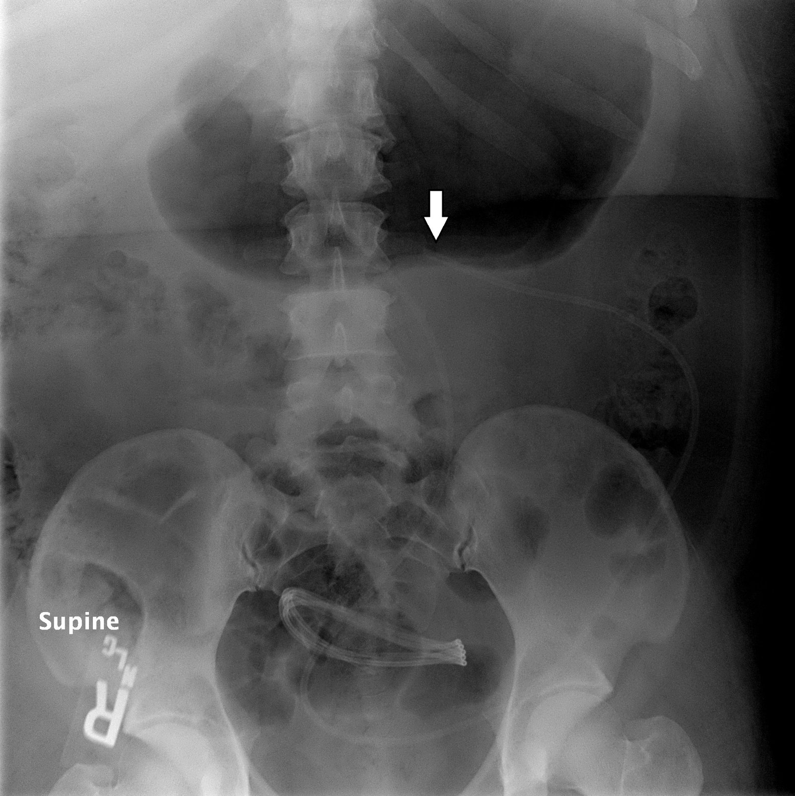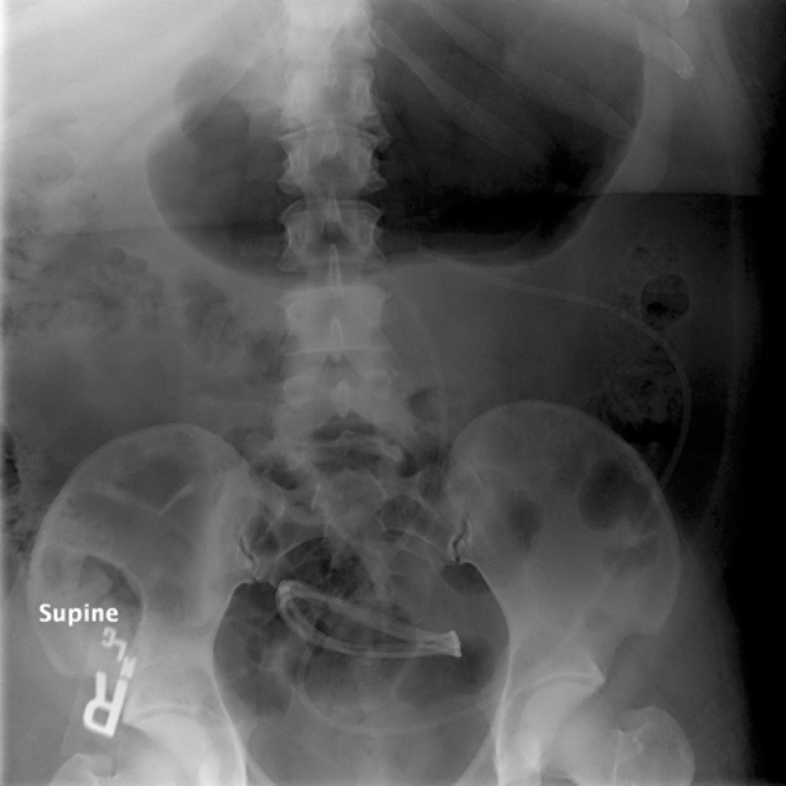 An immediate post-op abdominal x-ray performed after the patient’s VP shunt revision 30 days prior to this ED visit reveals the VP shunt tip in the mid abdomen.  A CT of the abdomen performed on the day of the ED visit reveals the VP shunt tip interposed between the spleen and the diaphragm.