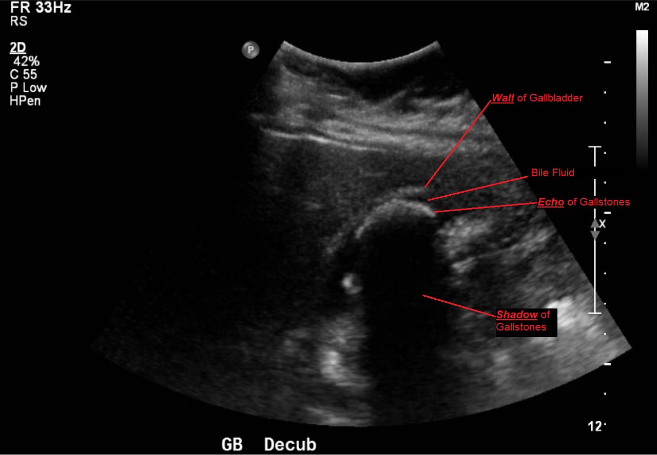Abdominal ultrasound showed the classic presentation of the Wall-Echo-Shadow (WES) sign. The superficial aspect of the gallbladder wall is represented by a hyperechogenic curve. Below this, bile fluid is represented by hypoechogenicity. Underneath the bile fluid is the echo of the dense border created by the collection of gallstones, represented by a hyperechogenic curve. Due to the high density of the gallstones, nothing deeper can be visualized (including other gallstones or the far end of the gallbladder); this is the shadow.